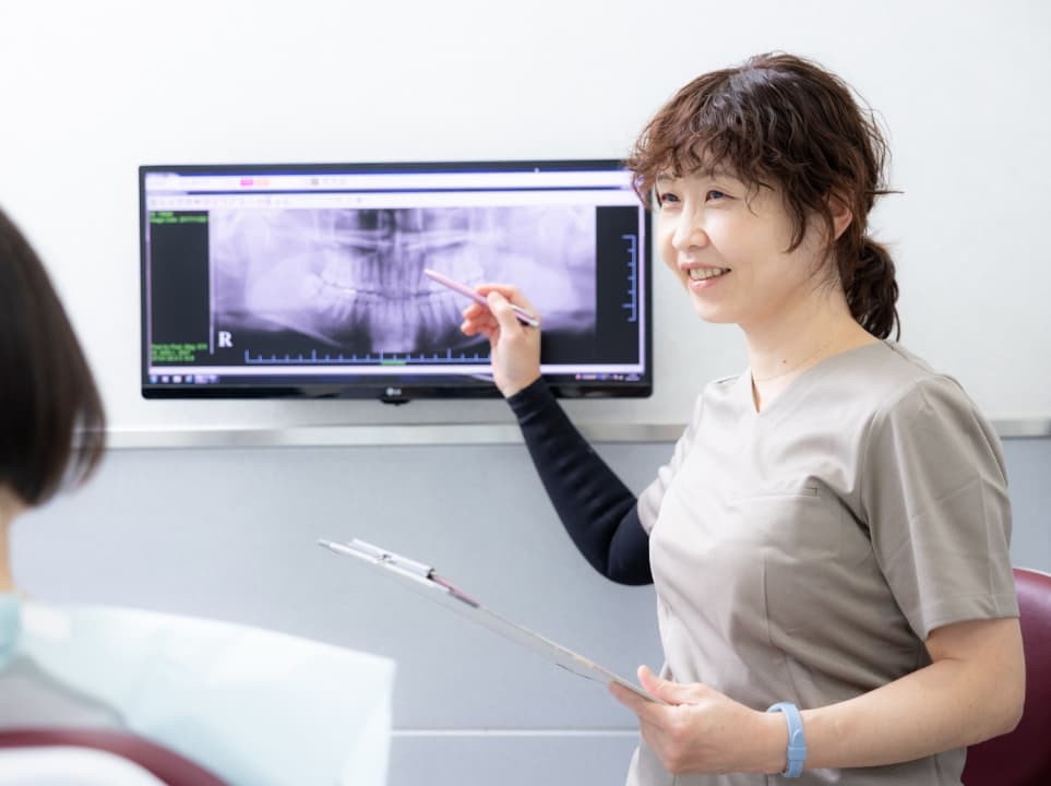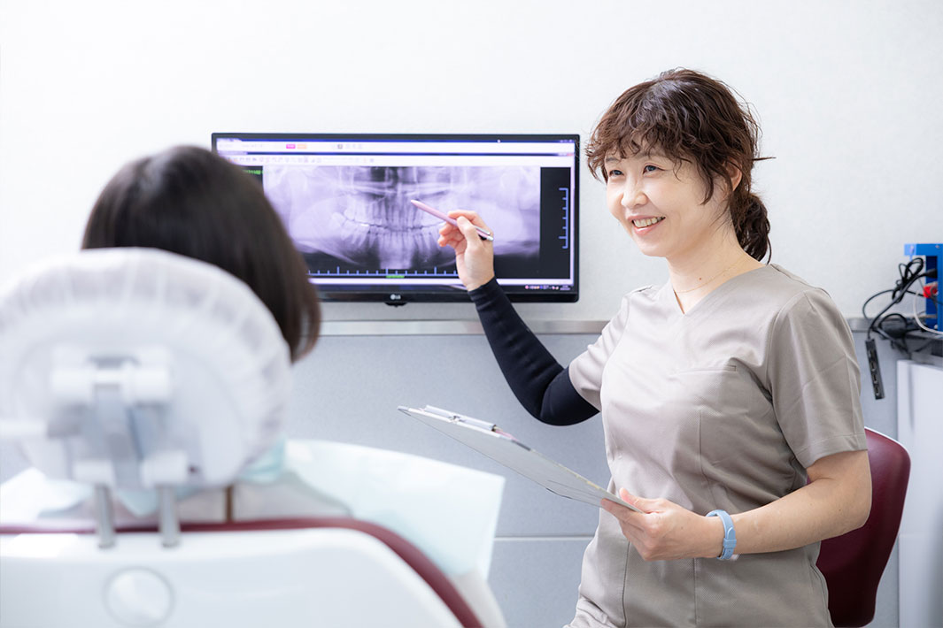 「おいしく楽しく食べる」「安心して食べる」ための口腔内を持続的に整える治療を目指しています。「食べる」ということの周辺には歯、咀嚼、味覚、嚥下等に加え、いろいろな要素が関わっています。人と会話しながら食事する場合には歯の見た目も重要な要素であると思います。それらを維持、改善していくことを目指し、それぞれの患者さんの年代やライフステージに応じて、患者さん自身にも納得いただける治療を心がけています。