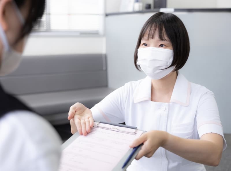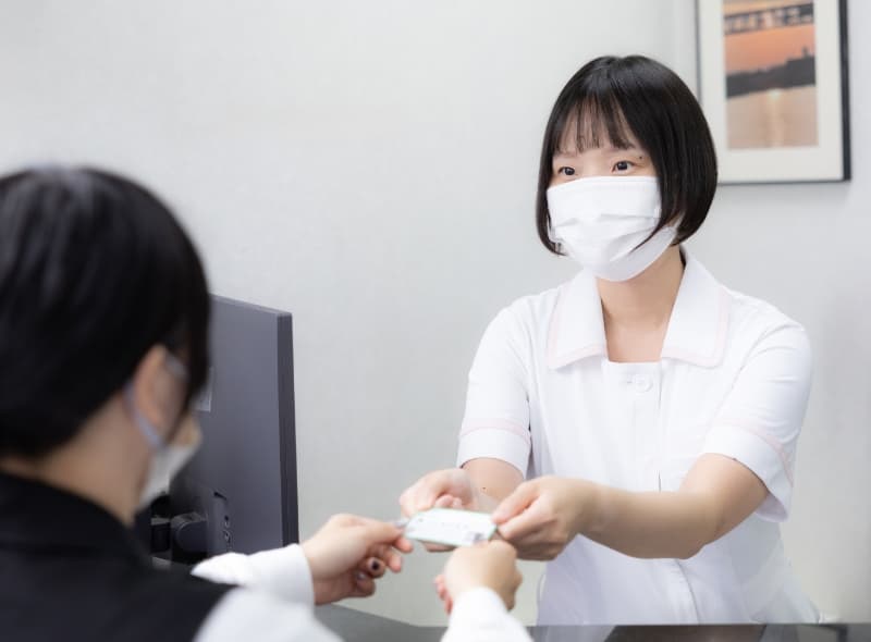 ご来院いただきましたら、受付をお願いします。初診の方には問診票をお渡ししますので、現在の症状やお悩み、治療に関するご要望などをご記入ください。ご記入内容について質問やご相談があれば、遠慮なくスタッフにお申し付けください。