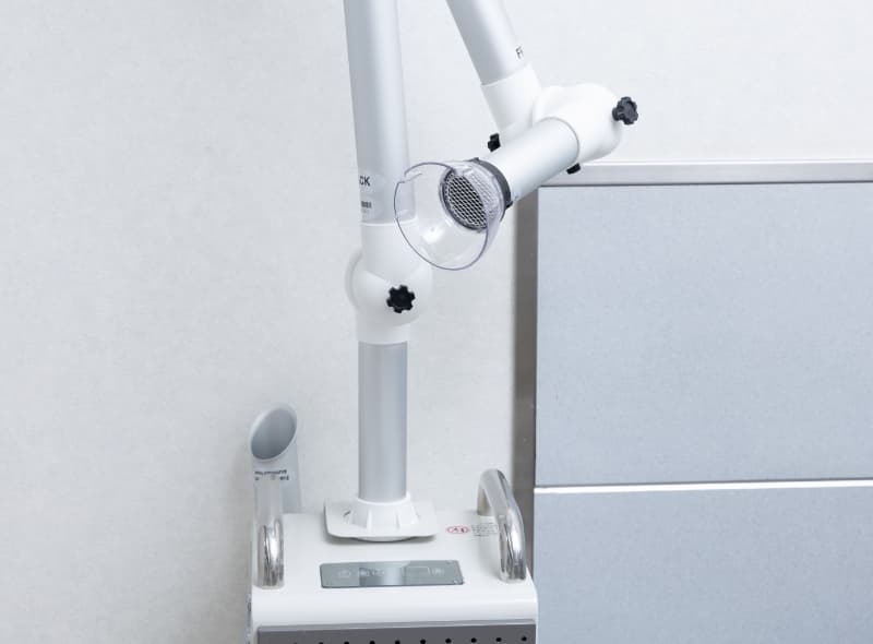 歯科治療では、切削片や水しぶきが飛散することがあります。当院の口腔外バキュームは、強力な吸引力により、微細な粉塵までも確実に除去する効果が期待できます。清潔で快適な治療環境を提供するために、口腔外バキュームは欠かせません。
