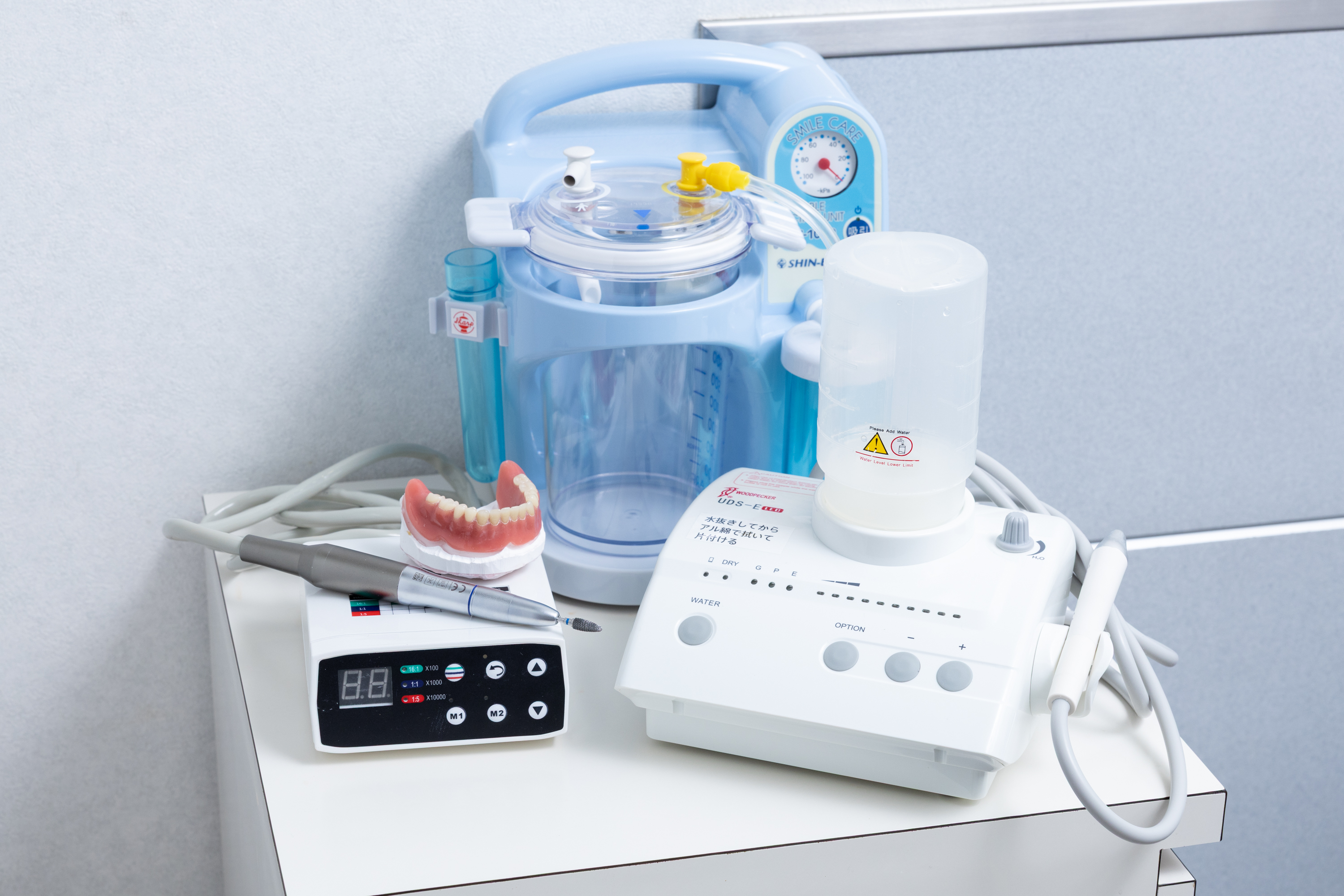通院が難しい方のご自宅や施設へお伺いするための、携帯型治療機器です。むし歯治療から入れ歯の調整まで、診療室とほぼ同等の処置が可能となります。口腔ケアの継続が、誤嚥性肺炎の予防や食事の楽しみを維持することにつながります。